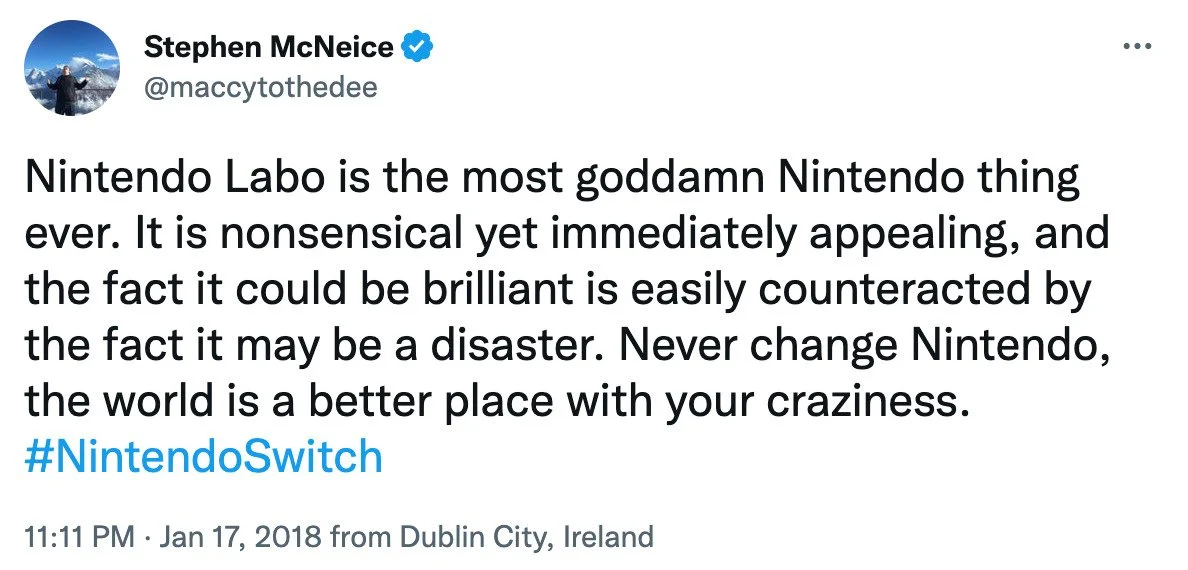 Today, one year after releasing the Nintendo Switch - a hybrid device designed to be both a home console and a portative tablet, Nintendo is aiming at further extending its gaming possibilities, just like the NES Zapper or the Gameboy Printer accessories did before. The Verge magazine gives praises to this product, saying it is the most innovative game console in years. Nintendo didn’t just stop there; in April 2018, they added a DIY dimension that allows players to build an immersive experience rather than just simply consuming a video game.